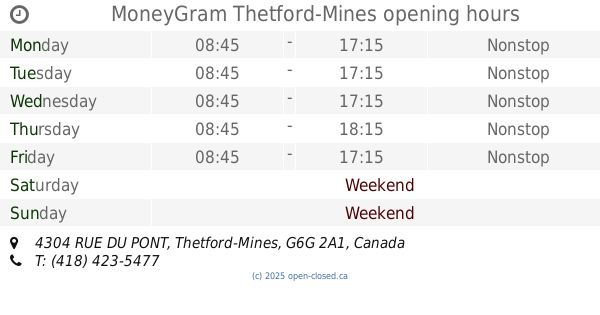 It is also possible to : Edit these OPENING HOURS of Branch MoneyGram In Thetford-Mines, 4304 RUE DU PONT,
